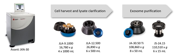 Use the J-LITE® JLA-9.1000 or JLA-12.500 high-capacity rotors to spin down cell cultures, then switch to the JA-30.50 Ti or the JS-24.15 rotors to easily perform exosome isolation.